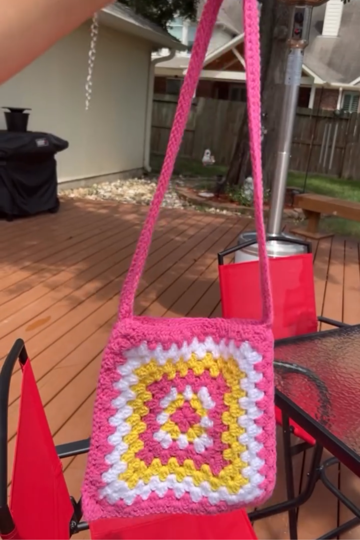 Pink, yellow and white summer bag. Granny square stitching , 10in all sides , with 20in strap. Custom colors and orders available !