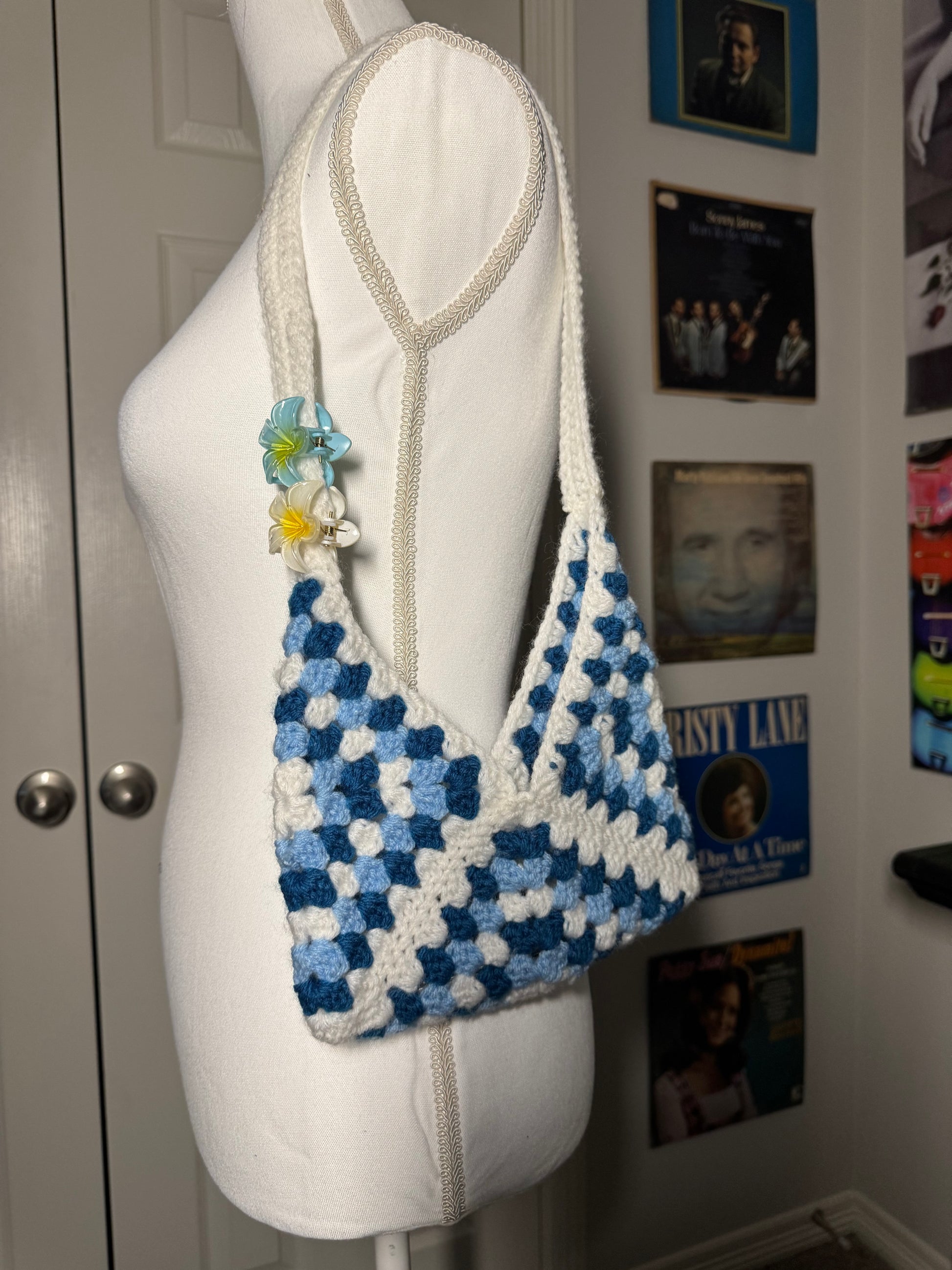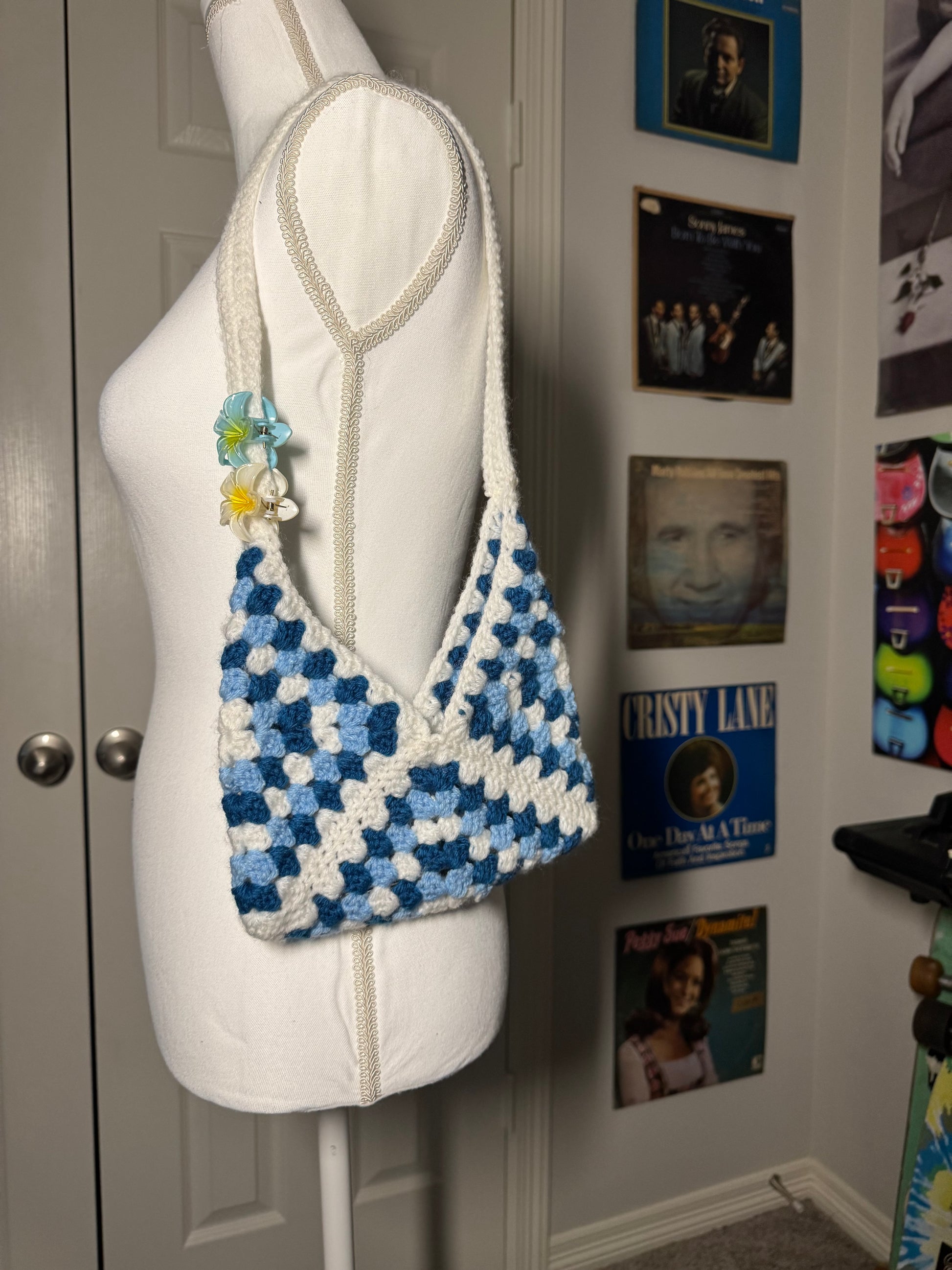 Blue multi shaded granny stitch bag. White shoulder strap to compliment squares , perfect for a sunny day out. Custom orders available.